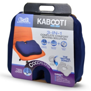 Het kussen positioneert je bekken en rug in de juiste stand en zorgt daaardoor voor pijnverlichting. Door de uitsparing tpv de stuit/heiligbeen zorgt het ervoor dat mensen met pijnklachten in dit gebied probleemloos kunnen zitten. Er zijn 2 varianten. De normale Kabooti en de Kabooti Ice met een uitneembaar koelpack tpv de stuit.